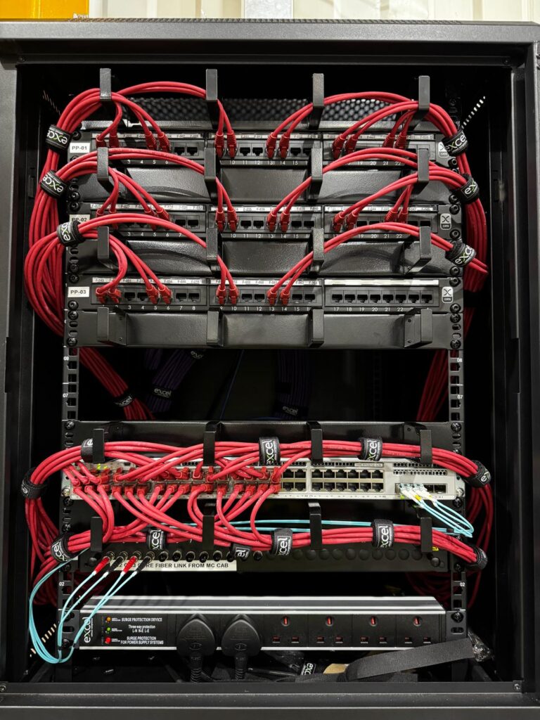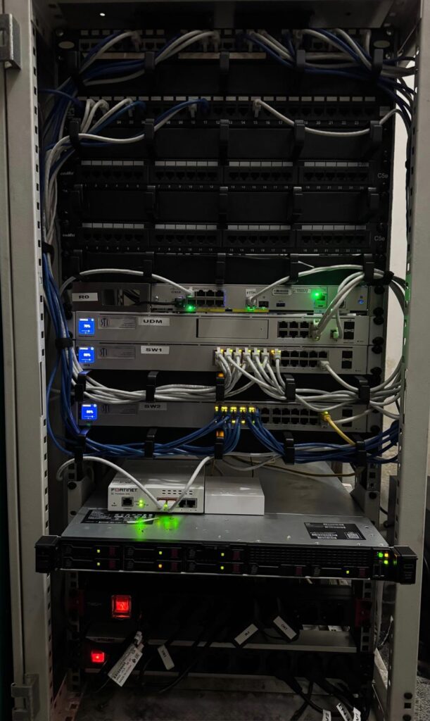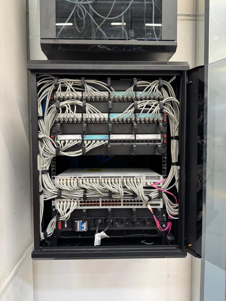 L’installazione ha previsto la configurazione di un armadio rack completo, all’interno del quale sono stati integrati apparati di rete attivi, tra cui un firewall per la protezione perimetrale e un controller centralizzato per la gestione della rete LAN. Questa architettura consente il monitoraggio costante del traffico dati, l’applicazione di policy di sicurezza e la gestione efficiente degli accessi.