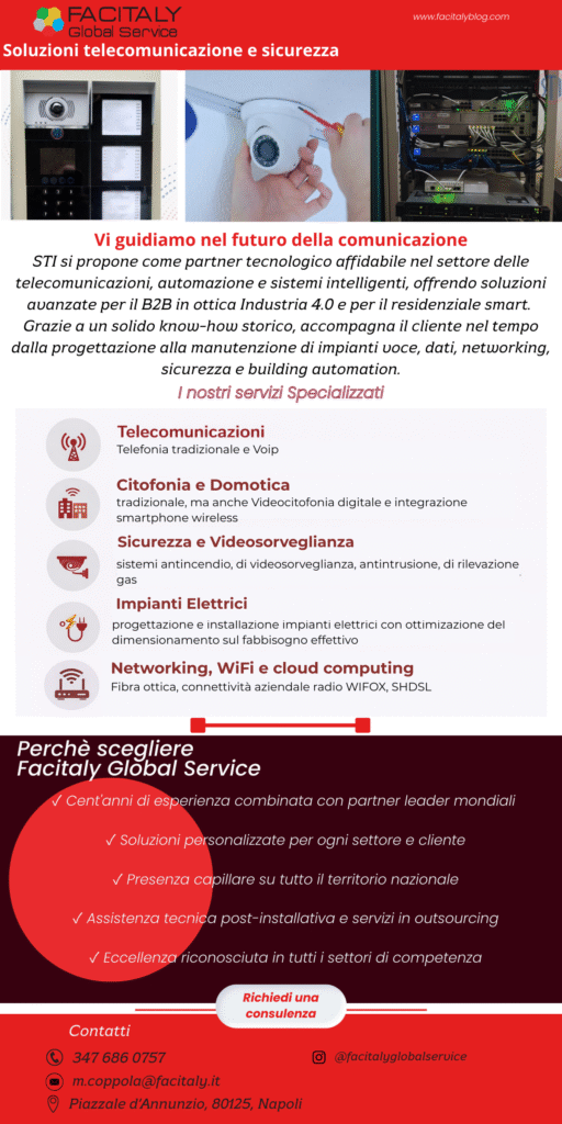 Facitaly Global Service opera come partner tecnologico nel settore delle telecomunicazioni, dell’automazione e della sicurezza, offrendo soluzioni avanzate per il mondo B2B e per il residenziale smart. Grazie all’azienda STI, Società Telecomunicazioni Integrate, che offre servizi che spaziano dalla progettazione alla manutenzione di impianti voce, dati, networking, accompagniamo clienti e imprese verso sistemi di comunicazione affidabili, innovativi e integrati.